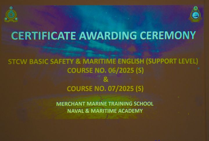 பயிற்சி, சான்றிதழ் மற்றும் கண்காணிப்பு (STCW) அடிப்படை பாதுகாப்பு மற்றும் கடல்சார் ஆங்கிலம் (ஆதரவு நிலை) பாடநெறி எண். 06/2025 (S) மற்றும் பாடநெறி எண். 07/2025 (S) ஆகியவற்றின் தரநிலைகளுக்கான சான்றிதழ் வழங்கும் விழா அக்டோபர் 15, 2025 அன்று கடற்படை மற்றும் கடல்சார் அகாடமியின் மினி ஆடிட்டோரியத்தில் நடைபெற்றது. இந்த விழாவில் வணிக கடல்சார் பயிற்சி பள்ளியின் பொறுப்பாளர் தளபதி (தெற்கு) அசங்க ராஜபக்ஷ கலந்து கொண்டார்.