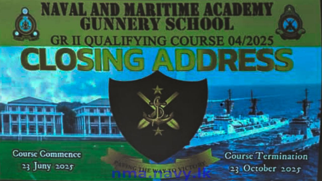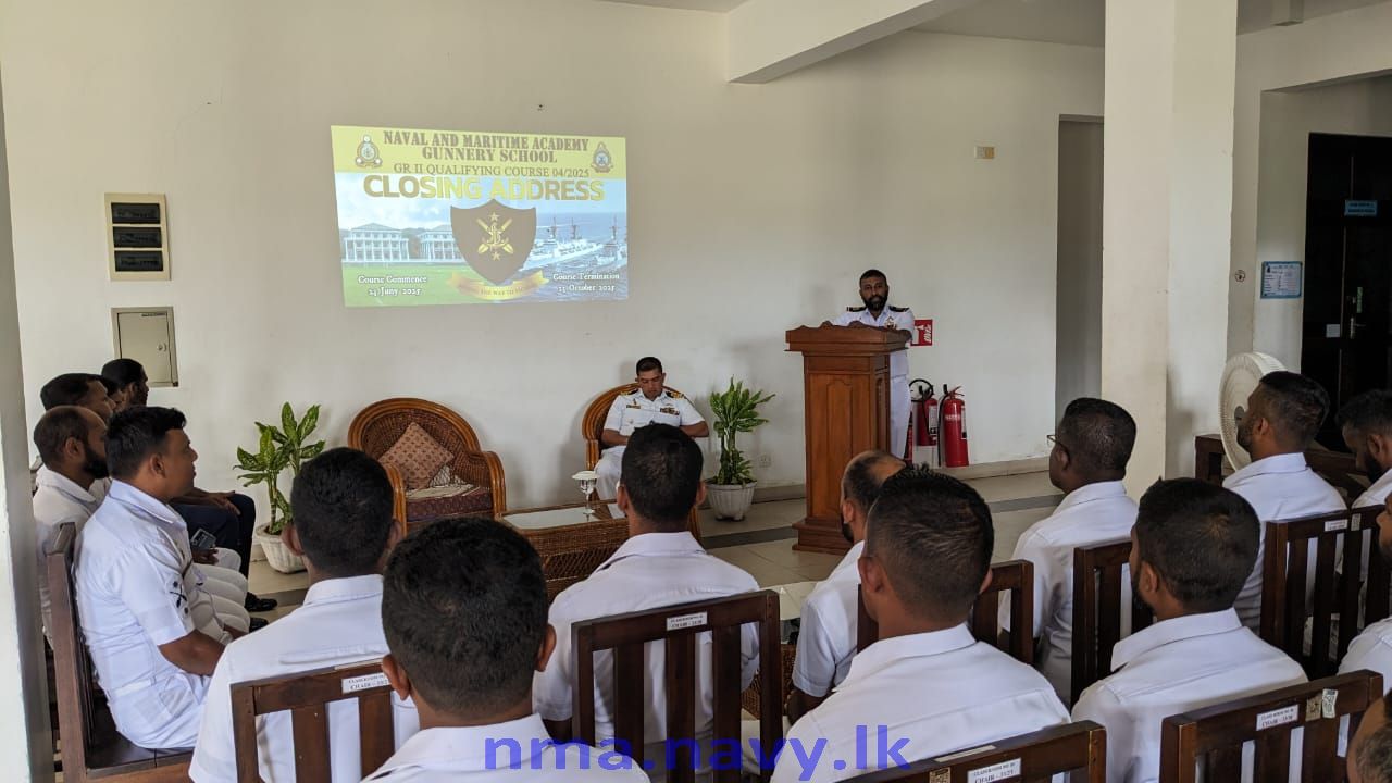 கடற்படை மற்றும் கடல்சார் அகாடமியின் கன்னரி பள்ளியில் 04/2025 ஆம் ஆண்டுக்கான GR II தகுதிப் பயிற்சிப் பாடநெறியின் நிறைவு விழா அக்டோபர் 23, 2025 அன்று நடைபெற்றது, இதில் பள்ளியின் அதிகாரிகள் மற்றும் பயிற்றுனர்கள் கலந்து கொண்டனர்.