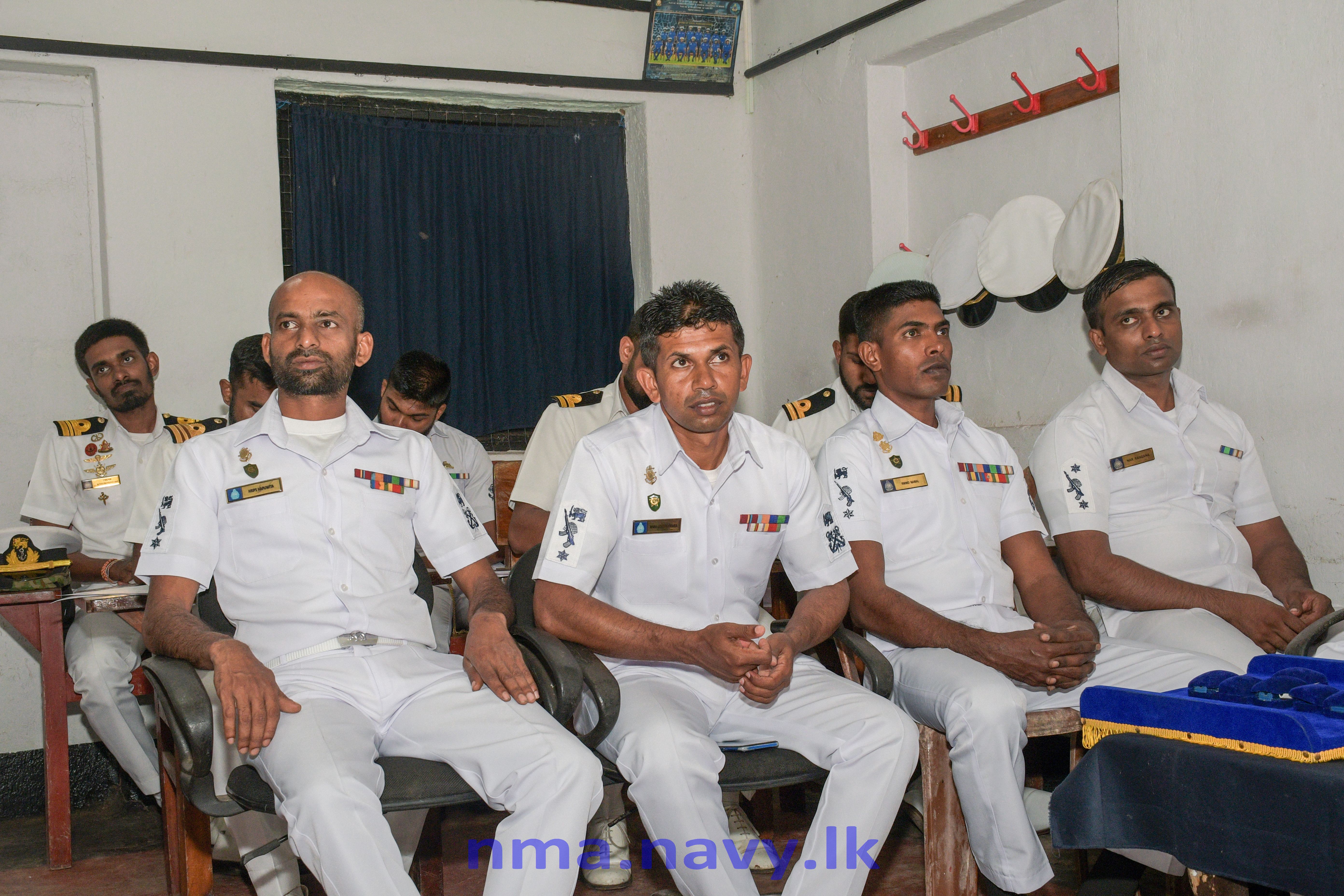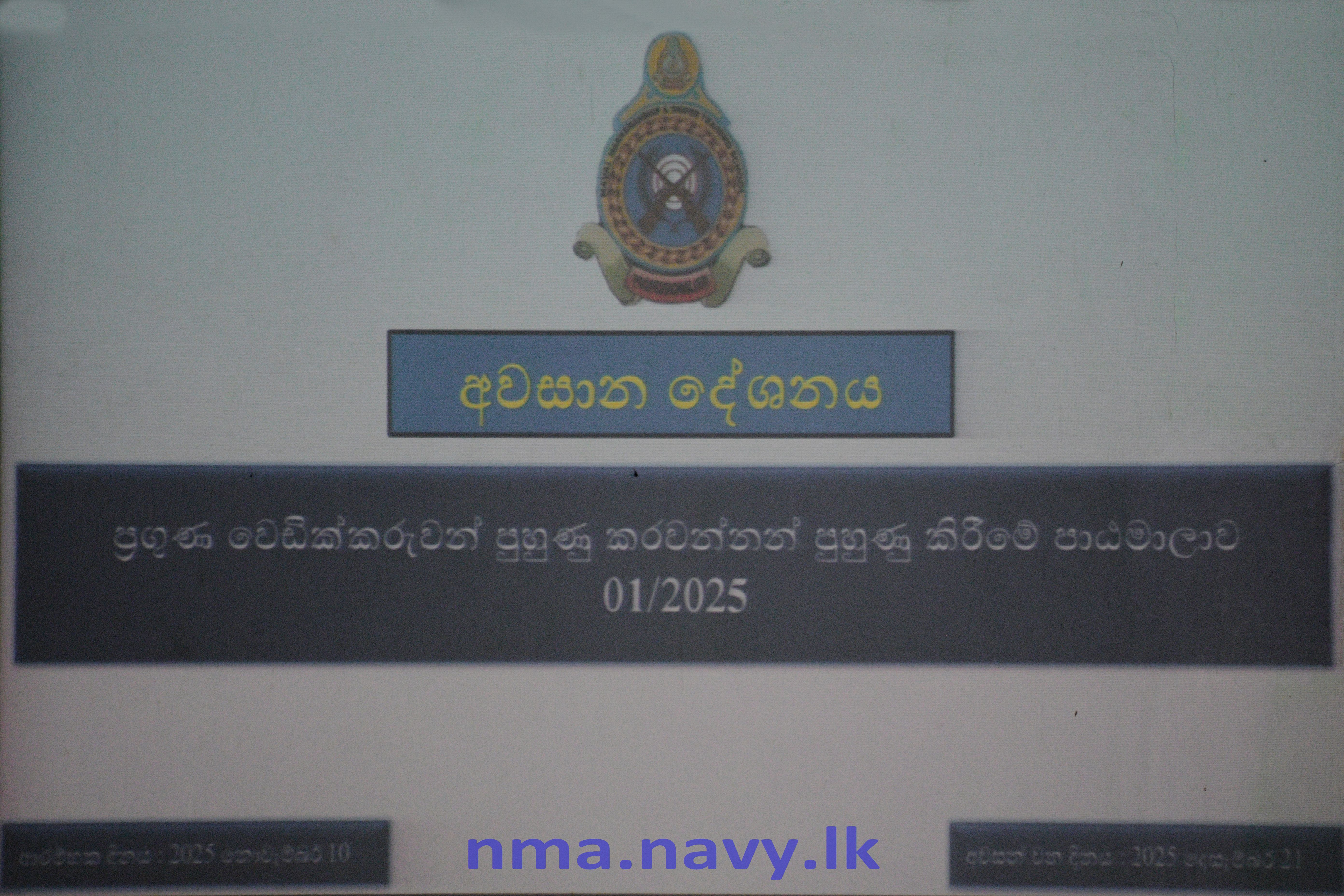 01/2025 ප්රගුණ වෙඩික්කරුවන් පුහුණුකරවන්නන් පුහුණු කිරීමේ පාඨමාලාවේ සමාප්ති උත්සවය දෙසැම්බර් 20 වන දින නාවික හා සාගරික ව්ද්යාපීඨයේ නාවික ප්රගුණ හා සැඟවුණු වෙඩික්කරු පුහුණු පාසලේ දෙවන අණභාර නිලධාරී උප ලුතිනන් (නාපාබල)ඒඑම්ඊඩී සෙනෙවිරත්න,ජ්යෙෂ්ඨ සහ කණිෂ්ඨ නාවික උපදේශකයින්ගේ සහභාගීත්වයෙන් පැවැත්විණි.