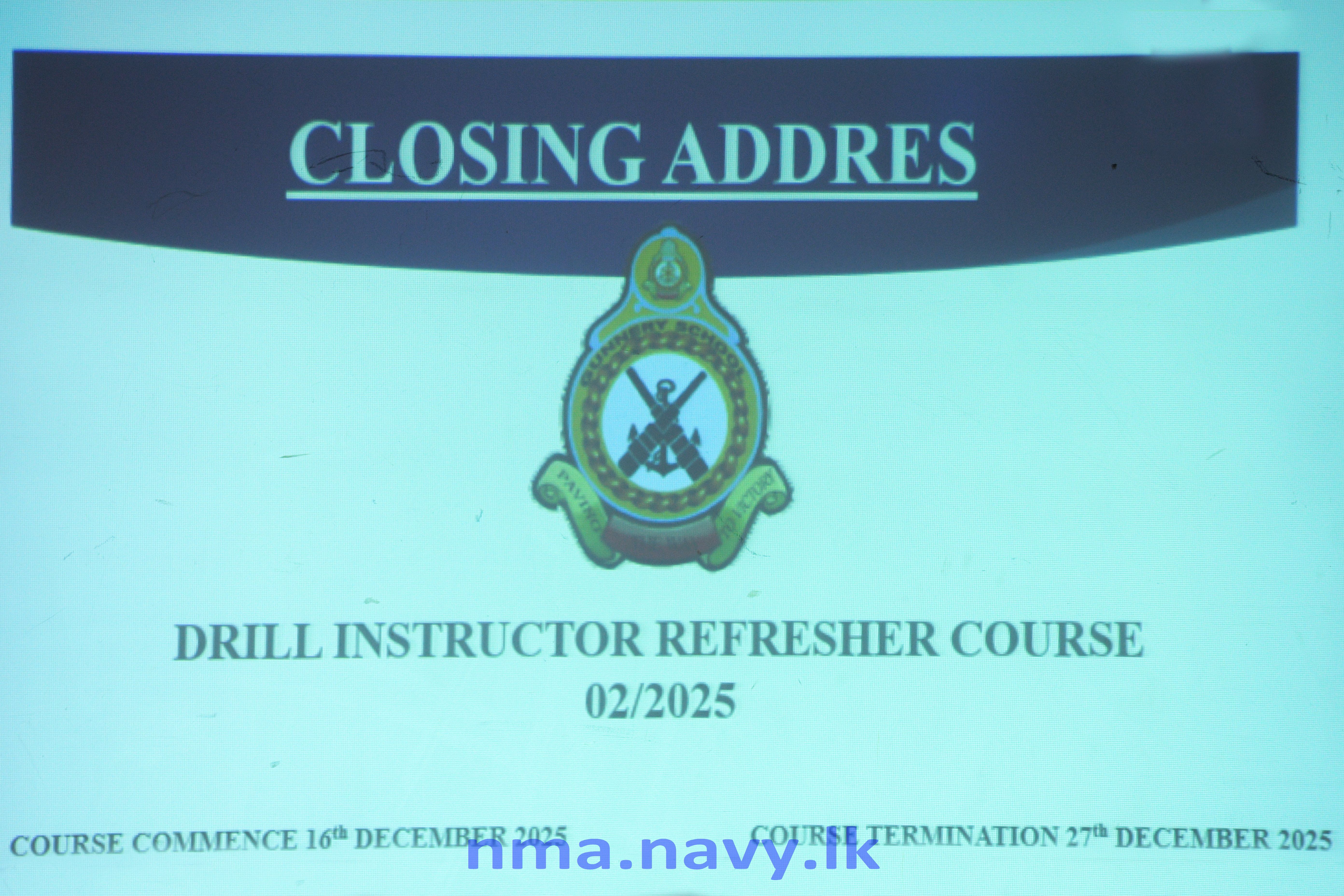 துரப்பண பயிற்றுவிப்பாளர் புத்தாக்கப் பயிற்சி 02/2025 இன் நிறைவு விழா 27 டிசம்பர், 2025 அன்று கன்னரி கடற்படை மற்றும் கடல்சார் அகாடமியின் அதிகாரிகள் மற்றும் பயிற்றுனர்களின் முன்னிலையில் நடைபெற்றது. இந்தப் பாடநெறி 16 டிசம்பர், 2025 அன்று பதின்மூன்று (13) மூத்த மற்றும் இளைய துரப்பண பயிற்றுவிப்பாளர் மாலுமிகளின் பங்கேற்புடன் தொடங்கியது, மேலும் இரண்டு (02) வார பயிற்சித் திட்டத்திற்குப் பிறகு நிறைவடைந்தது. பயிற்சியாளர்கள் கப்பல்கள் மற்றும் நிறுவனங்களில் தங்கள் துரப்பண பயிற்றுவிப்பாளர் கடமைகளை திறம்பட மற்றும் திறமையாகச் செய்வதற்கு தொழில்முறை அறிவை வழங்குவதை இந்த பாடநெறி நோக்கமாகக் கொண்டுள்ளது. அனைத்து பயிற்சியாளர்களும் பாடத்திட்டத்தை வெற்றிகரமாக முடித்துள்ளனர்.